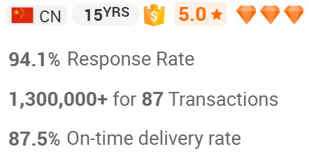Seit wann bei Alibaba tätig (hier im Bsp.: 15 Jahre), durchschnittliche Sterne-Bewertung (5.0 von 5.0, das ist perfekt) sowie weitere Angaben über die Antwort-Rate auf Anfragen, Volumen der Transaktionen und Prozentsatz der Lieferungen, die pünktlich waren.