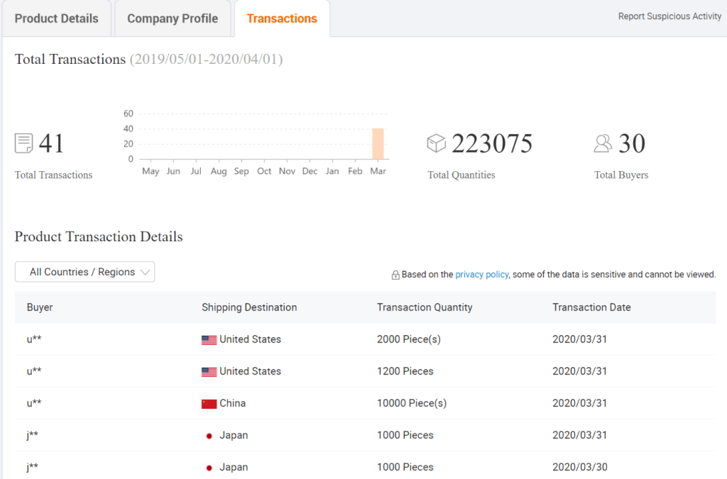 Transaktionsgeschichte: Weiter unten auf jeder Produktseite befindet sich bei Alibaba der Reiter „Transactions“, der die einzelnen Verkäufe der letzten Wochen abbildet (siehe unten). Diese helfen bei der Einschätzung der Lieferfähigkeit und verfügbaren Stückzahlen. Manche Produkte und Anbieter zeigen keine solche Transaktionshistorie, die sollte man eher vermeiden.