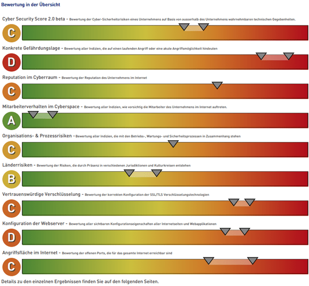 Mit dem Cyber Scoring Report + haben wir ein automatisiertes Verfahren bzw. Produkt entwickelt, welches einen übersichtlichen Report erstellt, in dem ihre IT-Risiken anschaulich und in verständlicher Sprache dargestellt werden. Dieses Cyber Scoring basiert auf einer Outside-In Analyse und wird aus öffentlichen Informationen gespeist. Diese unabhängige Erstbewertung der IT-Sicherheit bringt neben Detailerkenntnissen auch eine verständliche Gesamtübersicht: