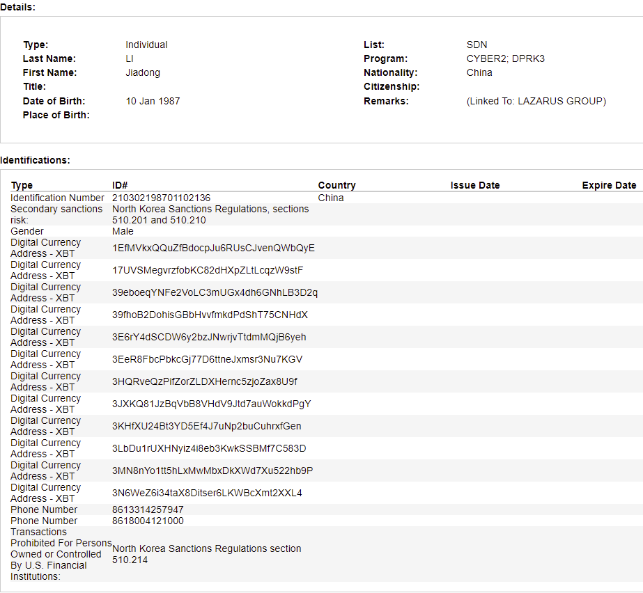 Bisher sind also 162 Namen von Personen und Gruppen in der Sanktionsdatenbank und zu vielen davon diverse Wallet ID-Nummern.