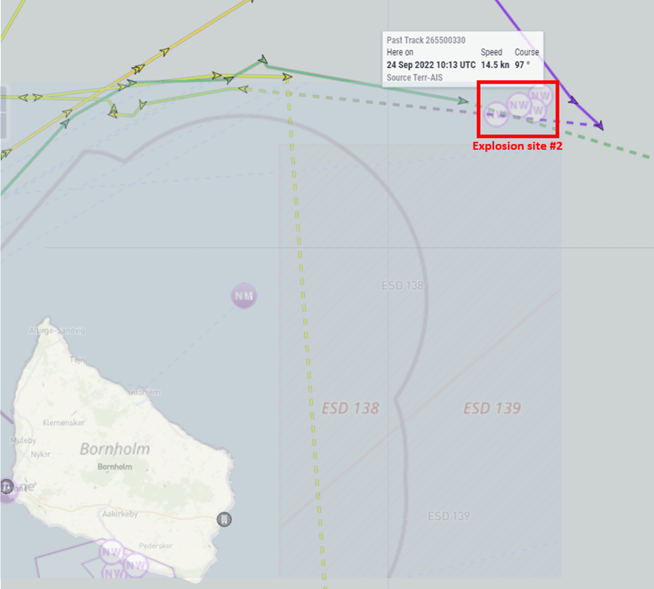 In the timeframe we focused on, between 21 and 26 September, we did not find any suspicious vessel movements around the site of explosion #1, southeast of Bornholm, in the data available on MarineTraffic. We neither identified ships that lingered near the first blast site for some time, nor any vessels of military origin passing by the area of site #1 in that timeframe.