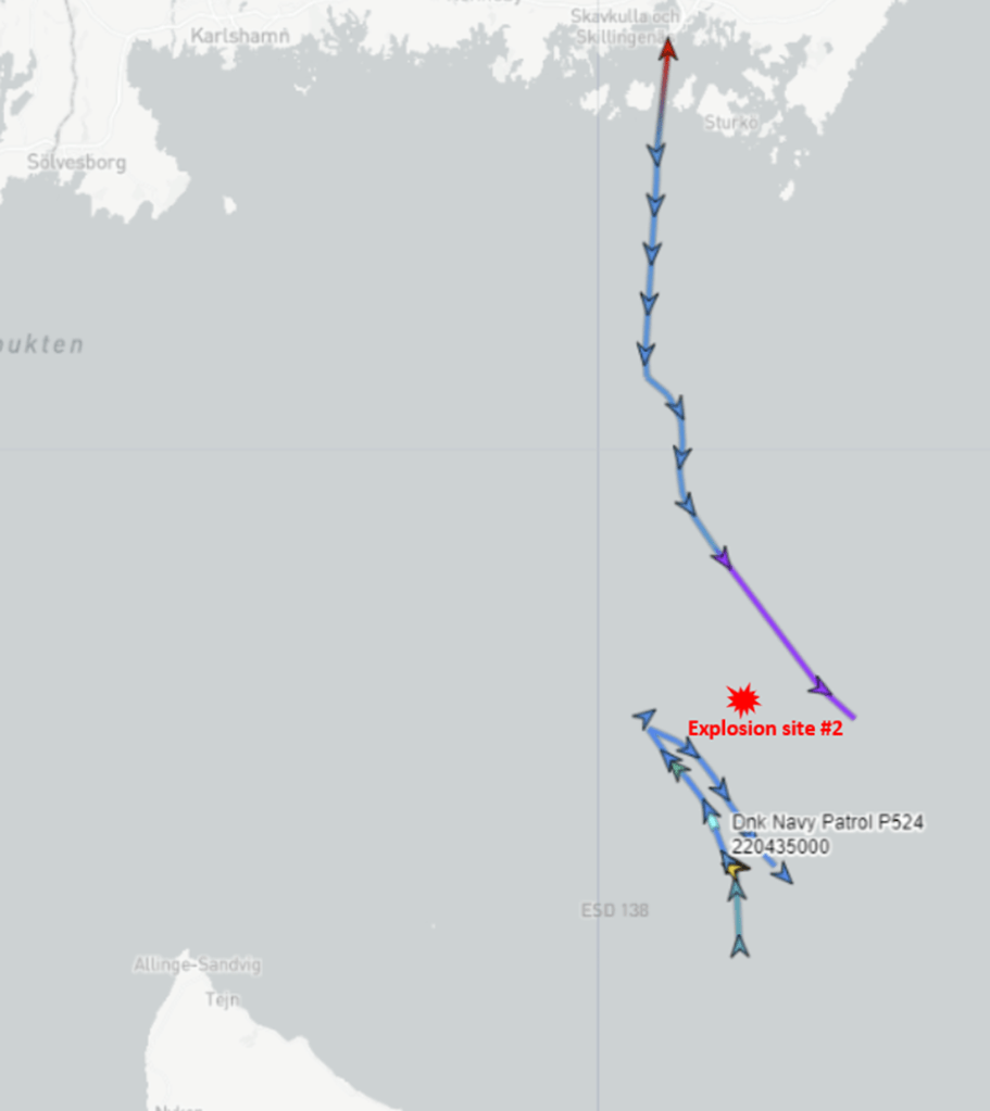 By the time the „Visby“ arrived near explosion site #2 around 01:00 p.m. local time (11:00 UTC), the Danish patrol boat „Nymfen“ had already left for the nearby port of Nexø on the island of Bornholm.
