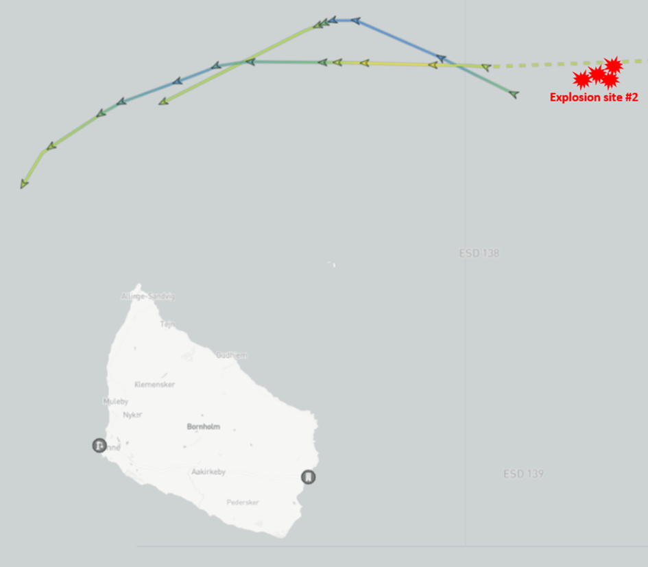 Off the Shipping Highway: By contrast, explosion site #2 lies 63 km northeast of Bornholm and just off a major shipping artery, a busy thoroughfare where hundreds of vessels pass through every day.