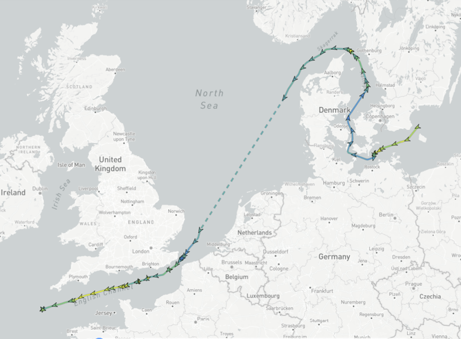 After the „Visby’s“ arrival near site #2, there is a 22-hour gap in the data until the ship reappears. (Note: Gaps like that are not unusual in marine traffic; we observed them with numerous commercial vessels as well. This occurs especially when ships move out of coastal AIS range, heading for the open sea.)