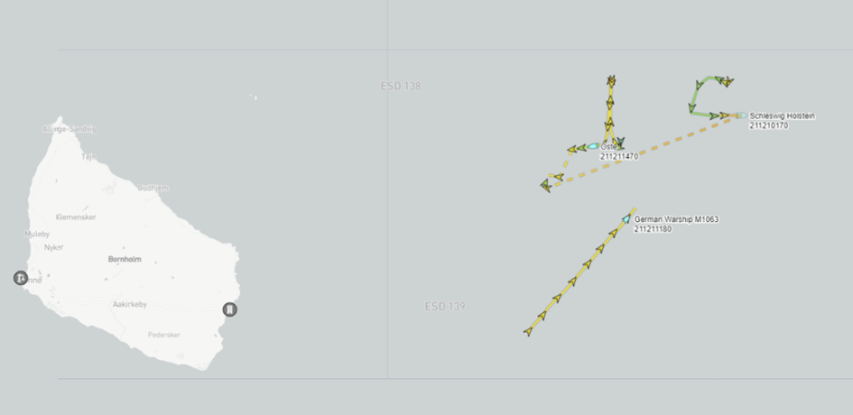 Die frei zugänglichen Tracking-Daten zeigten keine Militärschiffe anderer Nationen, die gemeinsam mit den Deutschen unterwegs waren, als sie zwischen dem 9. und 14. September östlich von Bornholm kreuzten. Laut einer späteren Pressemitteilung der deutschen Marine wurden sie bei den Manövern von dem deutschen U-Boot „U 32“ und dem Minensuchboot „Bad Bevensen“ begleitet. Letzteres tauchte tatsächlich am 13. September in den Tracking-Daten von MarineTraffic auf.