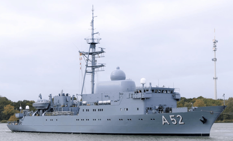 Die Bundeswehr nennt sie ihre „Augen und Ohren“: Die in den 1990er Jahren gebaute „Oste“ A52 (oben im Jahr 2018) ist ein Aufklärungsschiff – im deutschen Militär-Jargon auch Flottendienstboot genannt – das mit elektronischen, optischen und hydroakustischen Sensoren ausgestattet ist. Einzelheiten über seine Ausrüstung sind kaum zu erfahren, da sie natürlich der Geheimhaltung unterliegen. Laut Marineexperten gibt es generell verschiedene Arten von passiven Sonaren, die je nach Umgebungsbedingungen zum Zeitpunkt der Aufklärung eine Reichweite von 30 Seemeilen (55 km) haben können.