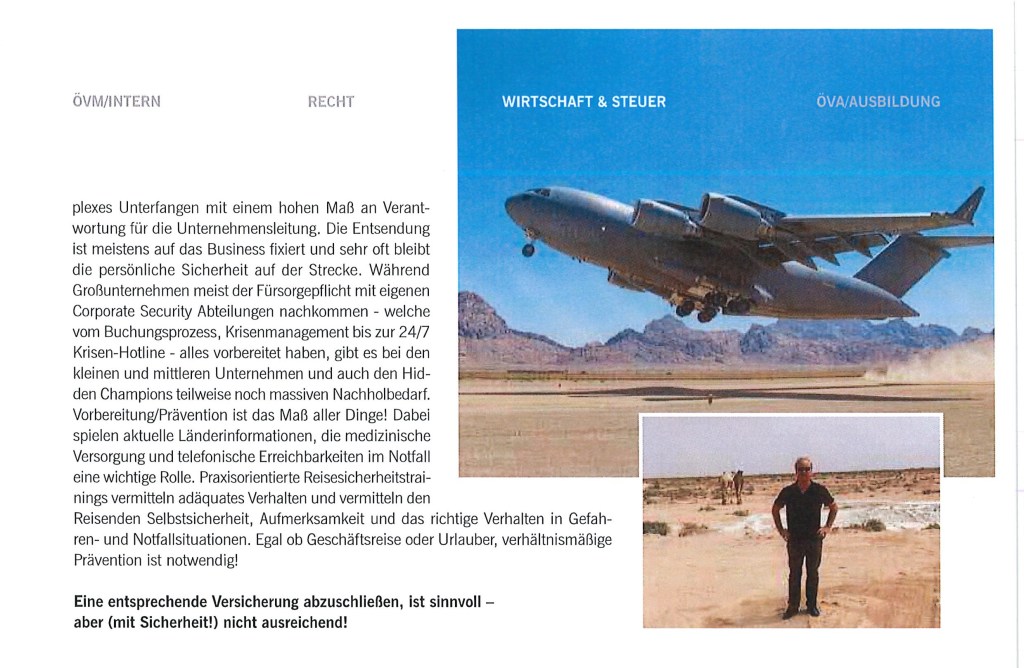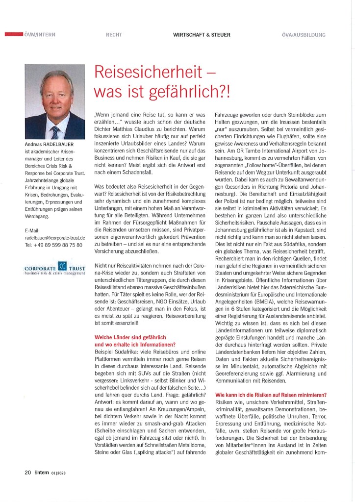 Wie bereite ich mich auf Reisen vor, was ist gefährlich, wo erhalte ich Länderinformationen und wie kann ich Risiken minimieren? Zusammengefasst in einem Artikel der aktuellen Ausgabe 1/2023 von Makler intern des ÖVM (Österreichischer Versicherungsmaklerring) von Andreas Radelbauer, Leiter Crisis Risk & Response bei Corporate Trust – Business Risk & Crisis Management